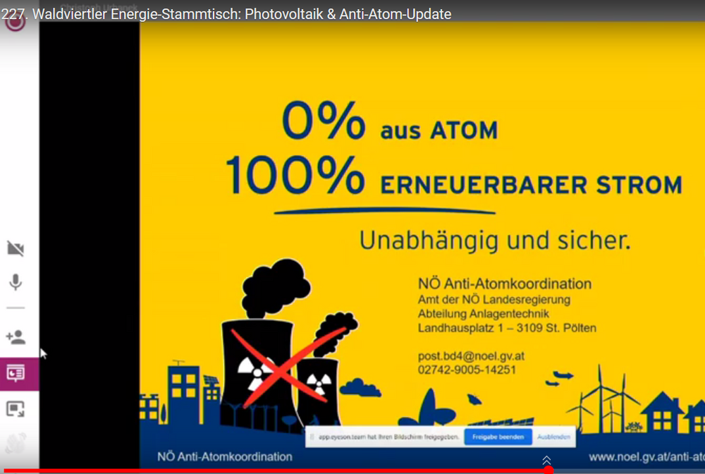 Der 227. Waldviertler Energie-Stammtisch wurde am 7.Mai 2020 live übertragen aus dem Nahversorger in Klein-Meiseldorf. Begrüßung und Einleitung von Renate Brandner-Weiß: Photovoltaik-Potenzial und -Nutzung generell Ing. Nikolaus Reisel: Vorstellung Projekte in Meiseldorf - Gebäudeintegrierte Photovoltaik: liefert Dackeindeckung und Strom für Schnellladestelle und Dorfzentrum - 1400 kW Photovoltaik-Freifläche im ehemaligen Steinbruch Mag. Christoph Urbanek: Aktuelles zu Kernkraftwerksbaustelle Mochovce, Dukovany, Endlager, Tschernobyl, …