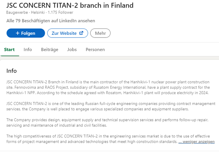 * Angespielt wird hier auf Unternehmen wie etwa JSC CONCERN TITAN-2, welches den Reaktor Hanhikivi-1 in Finland errichtet, aber auch RAOS, welches auch Rusatom gehört, s. Eintrag JSC Concern Titan 2, der zeigt, dass das ein Tochterunternehmen von Rosatom ist.