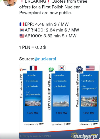 Aus dem laufenden Ausschreibungsverfahren für die ersten sechs Reaktoren in Polen wurden nun Zahlen geleakt. Laut diesen wäre der koreanische Reaktor um einiges billiger als die Mitbewerber Westinghouse und EDF. Laut dem polnischen Energieexperten Adam Blazowski würde der koreanische Reaktor APR1400 auf 2,64 Millionen USD/MW kommen, der AP1000 auf 3,52 Mio. USD/MW und der EPR auf 4,48 Mio. USD/MW. Hier sein Tweet: