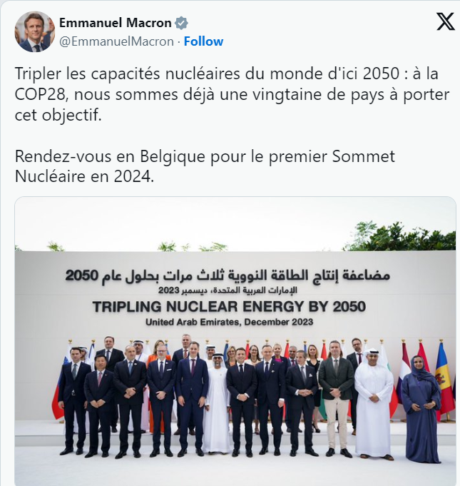Unter den befremdlichen Manövern der ortsansässigen und internationalen Erdöllobby könnte es fast untergehen, doch auch die Atomlobby war sehr erfolgreich. Ein Bild sagt mehr als tausend Worte, wie hier etwa Präsident Macrons X-Account, der sich auf ein Rendezvous im Belgien freut. Es ist kaum zu glauben, aber doch: Ein Atomgipfel wird parallel zum EU-Summit der Regierungschef stattfinden, zu dem auch die IAEO lädt.