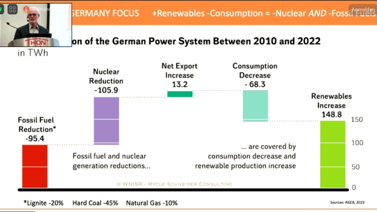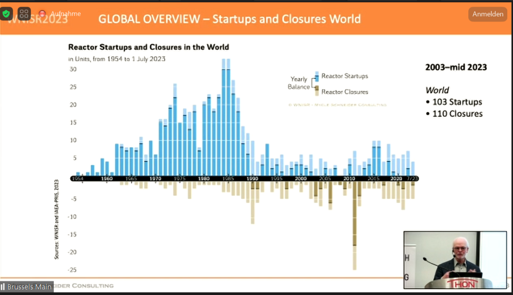 Und noch eine interessante Einschätzung zur von den Atomfreunden oft geäußerten Selbstvermarktung, wonach Erneuerbare und Atomenergie sich aktuellen und vor allem künftigen Energiesystem gut ergänzen würden, meinte Mycle Schneider am Beispiel des im April 2023 in Betrieb gegangenen EPR Olkiluoto-3, dass bereits im Mai 2023 die Leistung wieder reduziert wurde, da die Strommarktpreise und Flexibilität der Erneuerbaren einen Betrieb unwirtschaftlich machten. Bekanntlich müssen AKW möglichst durchgehend laufen, um irgendwie profitabel zu sein. Je höher der Eneuerbarenanteil mit den sehr niedrigen Produktionskosten, desto schwieriger wird der Markt für die AKW werden.