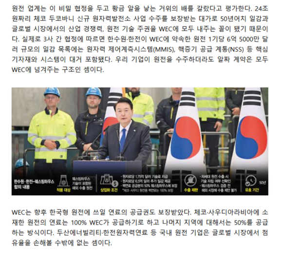 Darüber hinaus wurde für die Dauer von 50 Jahren vertraglich geregelt, dass der US-Firma Westinghouse auch folgende Goodies bei jedem Export von KHNP zufallen werden: