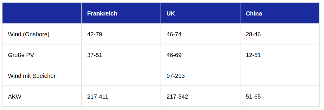 Dieser Wert umfasst alle mit dem Bau und Betrieb eines Kraftwerks verbundenen Kosten (Investitionskosten für den Bau, Brennstoff, Betrieb, Wartung und Entsorgung) und legt sie auf in der Lebensdauer des Kraftwerks erzeugten Megawattstunden um. Für Großbritannien, Frankreich und China, also Länder, die Kraftwerke aller Art bauen, fällt die LCOE-Kennzahl für erneuerbare Energien wesentlich günstiger aus. Im Falle der europäischen Länder ist der Unterschied erheblich, die Details zeigt die nachstehende Tabelle.
